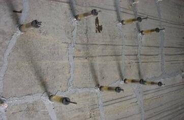 以一定的压力将低粘度、高强度的高分子聚合物裂缝灌缝胶注射入裂缝内,胶液固化后将开裂两侧的混凝土连接成结构整体;胶液还能进一步渗透到裂缝周围的混凝土毛细缝隙中,形成较宽的加固带,并能沿着钢筋走向渗透,保护钢筋和增加钢筋与混凝土的粘合力,起到对裂缝修复并对结构局部增强并提高耐久性的作用。