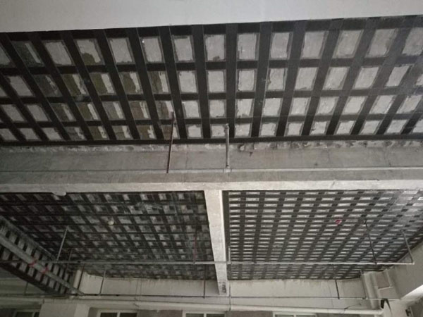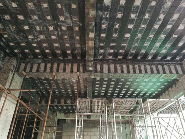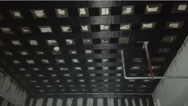 2 针对现场产生的现象,我公司经过现场勘查、测量、楼板承载力验算,对楼板上出现的裂缝进行注胶、修补,板底粘贴碳纤维提高承载力,板面采用高强度聚合物材料全面处理,加固后经检验楼板的防水效果、及承载力有显著提高。