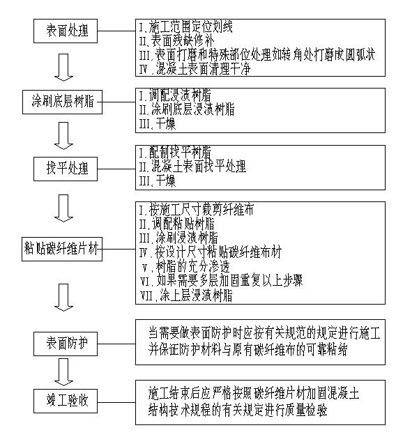 施工准备→混凝土表面打磨处理→卸荷→混凝土表面修补→粘贴纤维布→固化→检验→表面防腐处理。